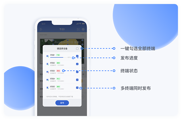 無需到達終端設備前,即可查看終端在線/離線/播放/停止等登錄狀態,省時省力;支持遠程控制終端播放/停止/重啟/休眠/喚醒/刪除/名稱修改等操作。